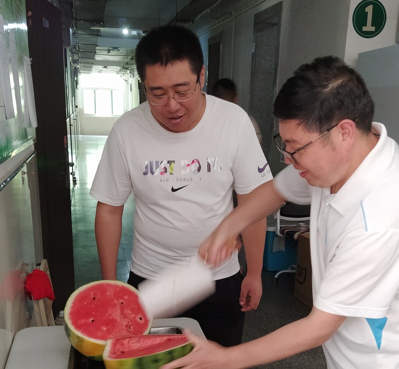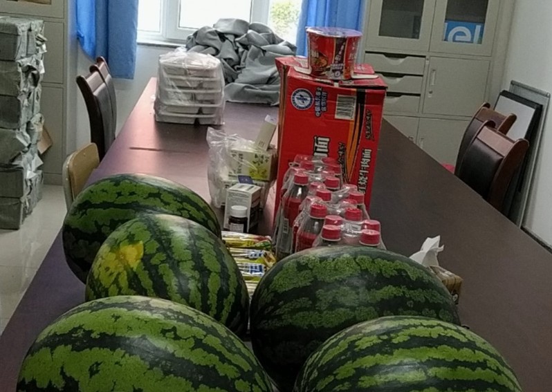 自疫情以来,荣成学院工会一直心系学院,心系广大教职工。当下正值毕业季,全体教职工都参与到了为毕业生打包行李的工作中,打包行李工作量大而又繁杂,教职工在炎热的夏季倍加辛苦。学院工会在12号学生公寓119室建立了临时休息站,准备了西瓜、泡面、饮品等食物和藿香正气水、思密达、创可贴、碘伏等常用药品,以备广大教职工不时之需。同时学院工会主席黄浩宇带领工作人员将西瓜分配到各个学生公寓,并现场分切西瓜服务大家,为大家在疲劳之余送上丝丝清凉和关怀,为特殊时期下的学院工作做好服务保障工作,尽自己的一份微薄之力!