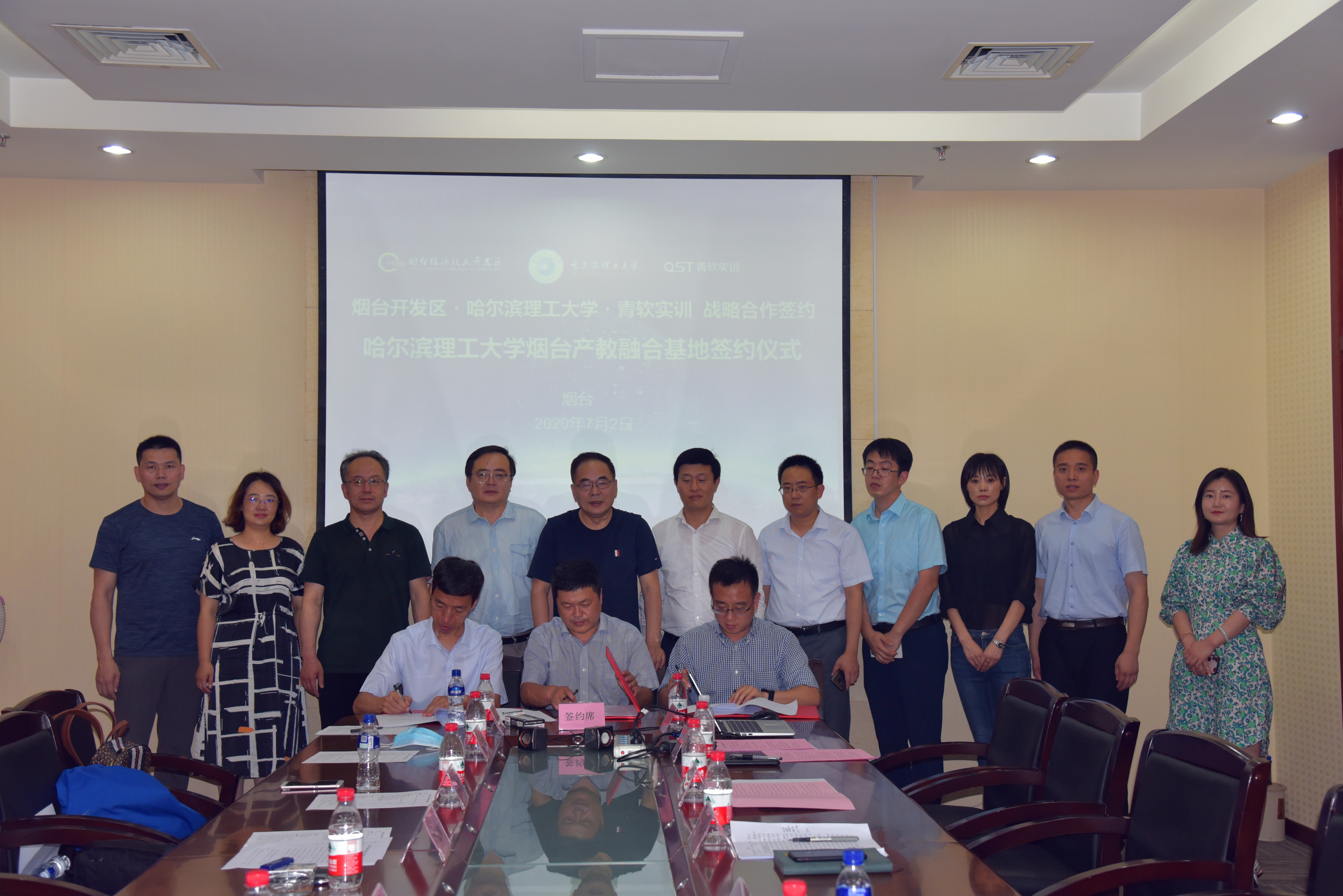 7月2日上午,哈尔滨理工大学与烟台开发区、青软实训在烟台新兴产业产教融合基地签署校政企合作协议,哈尔滨理工大学副校长刘胜辉,学校党委常委、工会主席兼荣成学院院长徐向晨,荣成学院常务副院长杜野及相关部门负责人;烟台开发区党群工作部副部长、烟台八角湾国际人才港推进服务中心主任于春光,烟台八角湾国际人才港推进服务中心副主任江荣,处长吴昊;青软实训董事长刘全,烟台基地总经理姜海波,总部基地渠道副总经理袁莎莎,烟台基地教学总监袁军,总部基地渠道经理王振出席了签约仪式,并共同参观青软实训烟台基地。签约仪式由烟台基地总经理姜海波主持。