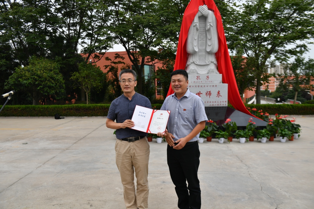 校党委常委、工会主席兼荣成学院院长徐向晨与济南校友会名誉会长李善峰(绝缘78级)共同为孔子雕像揭幕