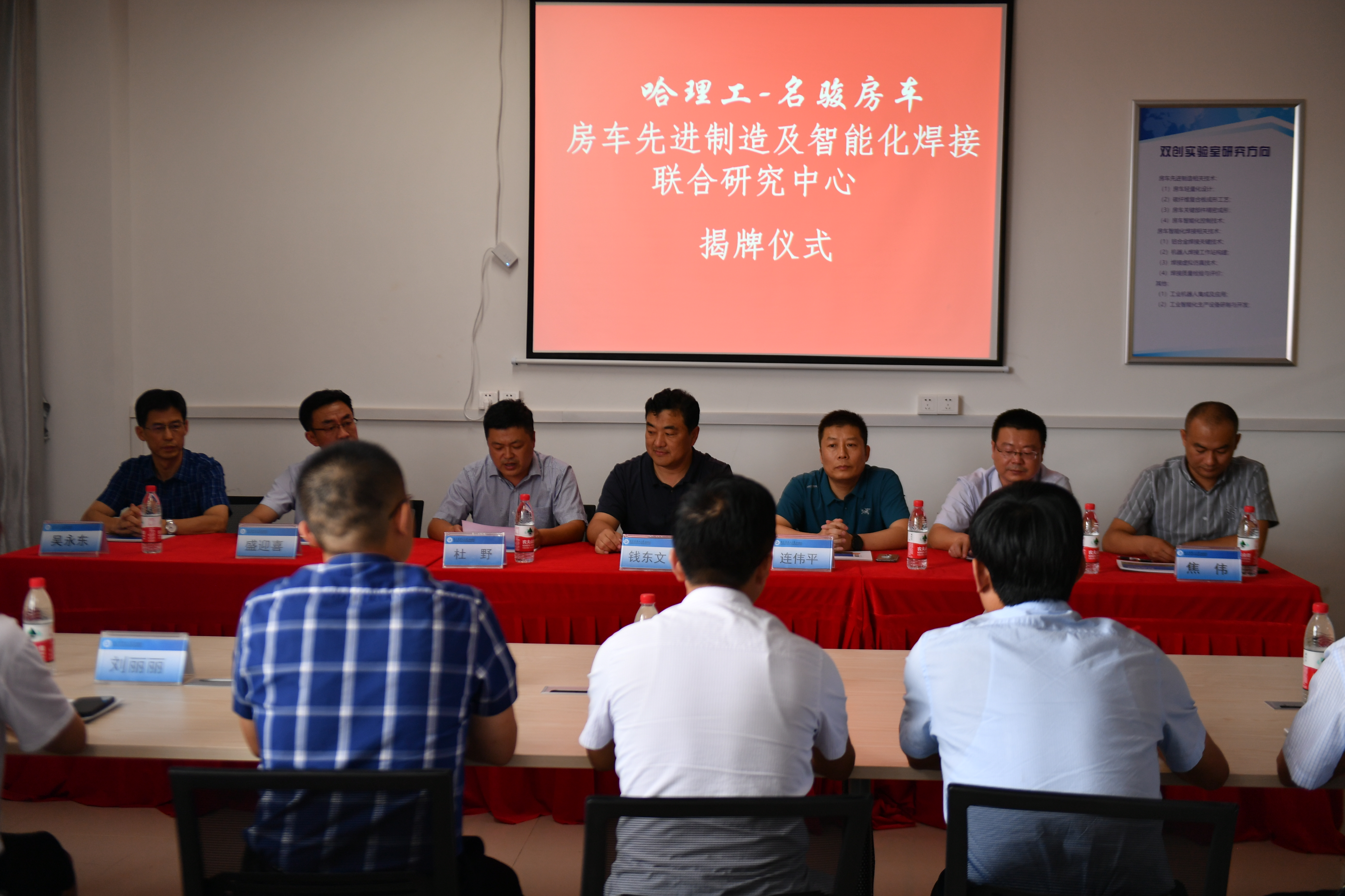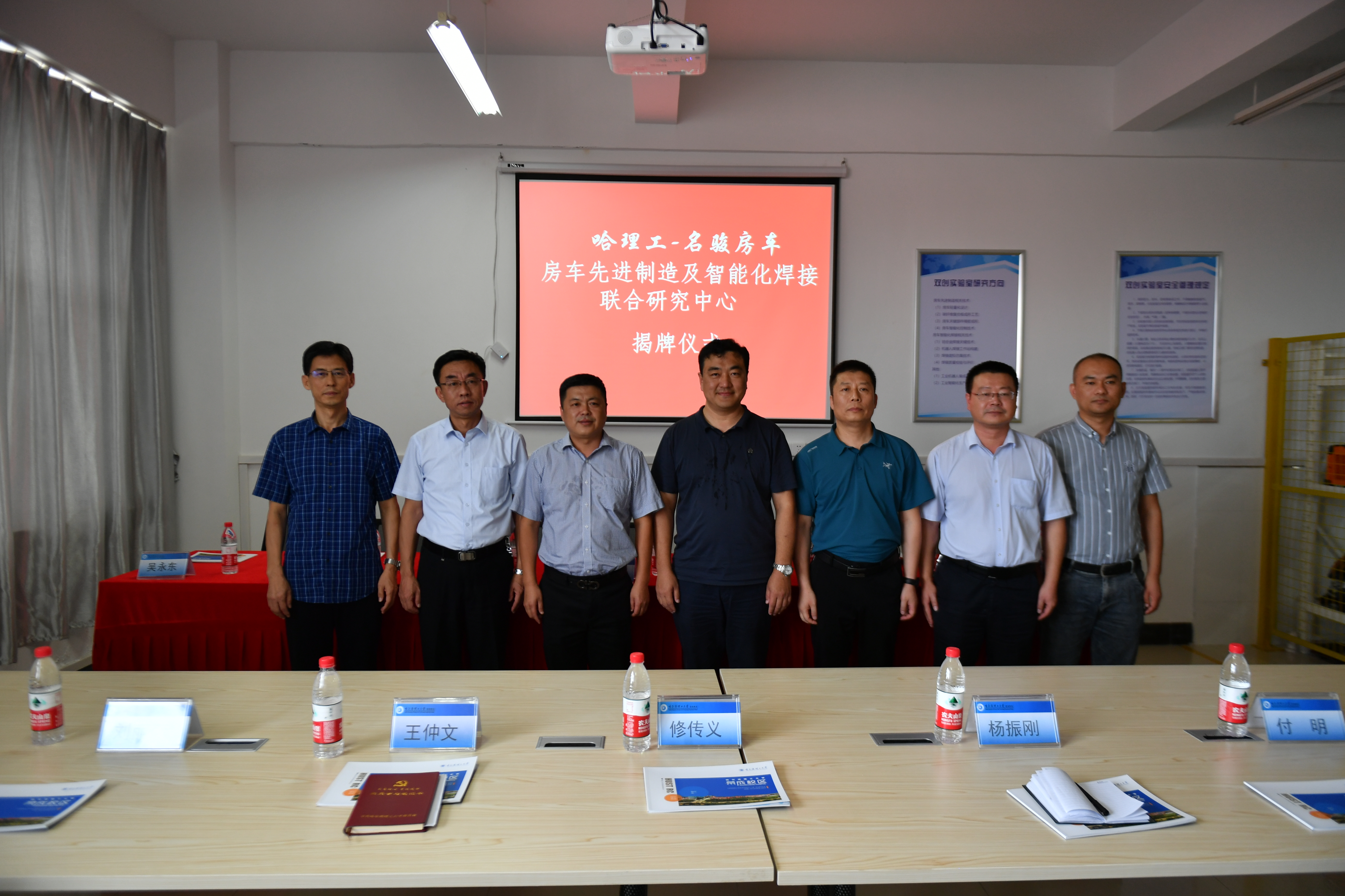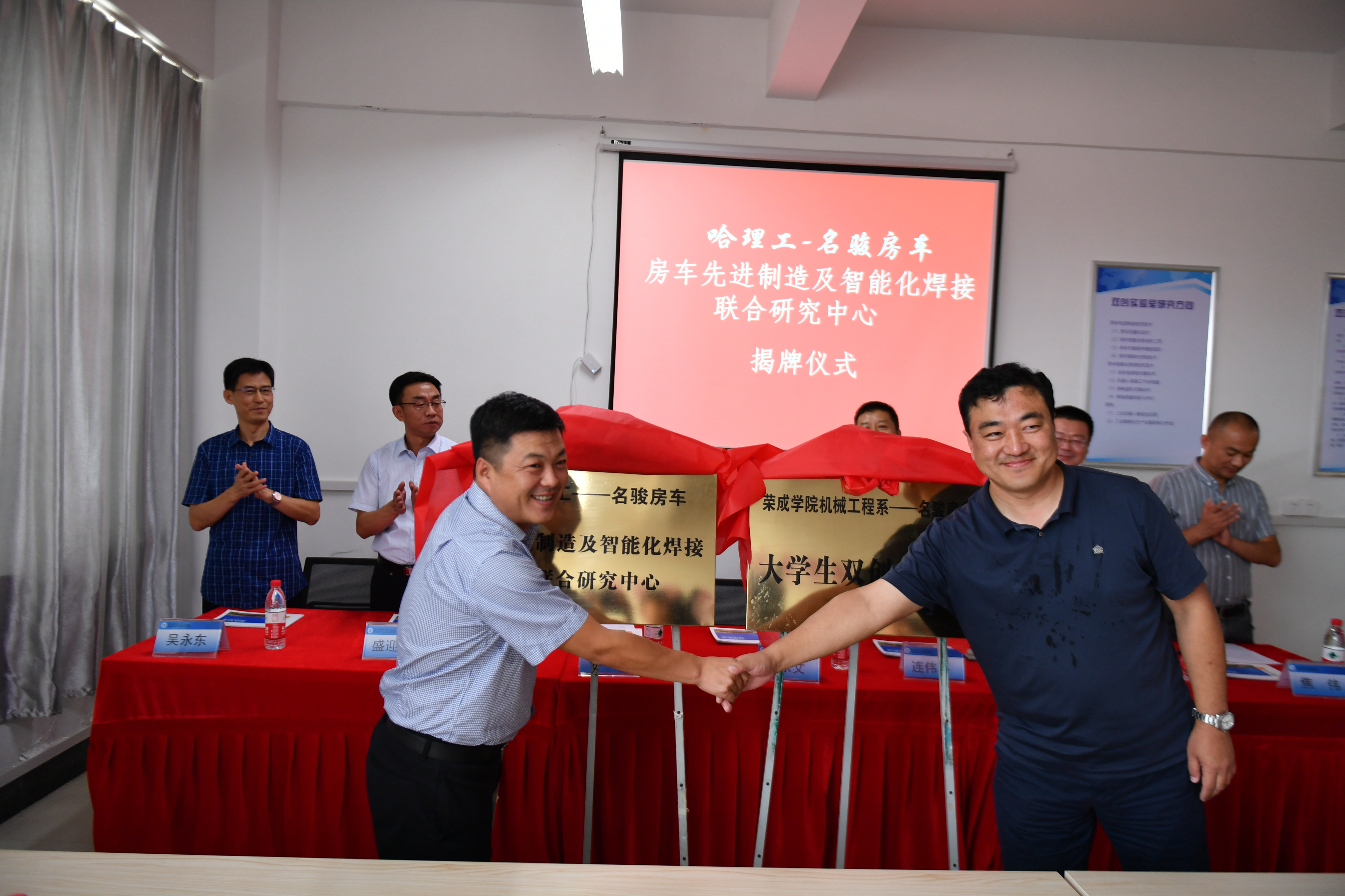 随后,杜野院长和钱东文董事长共同为“哈理工-名骏房车先进制造及智能化焊接联合研究中心”、“荣成学院机械工程系-名骏房车大学生双创实验室”揭牌。