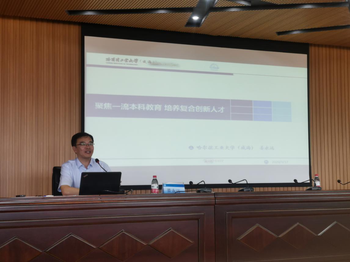 为庆祝学校建校七十周年,推进“双一流”建设”,2020年9月17日下午,荣成学院邀请哈尔滨工业大学(威海)教务处处长、博士生导师姜永远教授来院做专题报告。姜永远教授以“聚焦一流本科教育、培养创新复合人才”为题,结合全国教育大会精神,分析了百年未有之大变局背景下的高等教育新形势,分享了哈工大(威海)在专业建设和课程建设方面的宝贵经验。报告由教师发展中心主任董晶颢主持,我院全体教师参加了专题报告会。