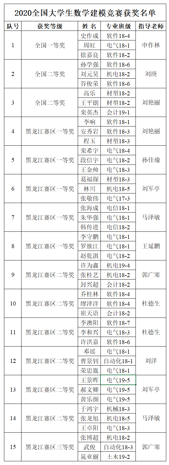 2020年全国大学生数学建模竞赛于9月10日至13日举行,荣成学院共选拔出19支队伍参加此次竞赛,共获得全国一等奖1项、全国二等奖2项;黑龙江赛区一等奖5项、黑龙江赛区二等奖6项和黑龙江赛区三等奖1项。