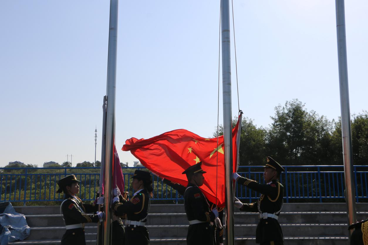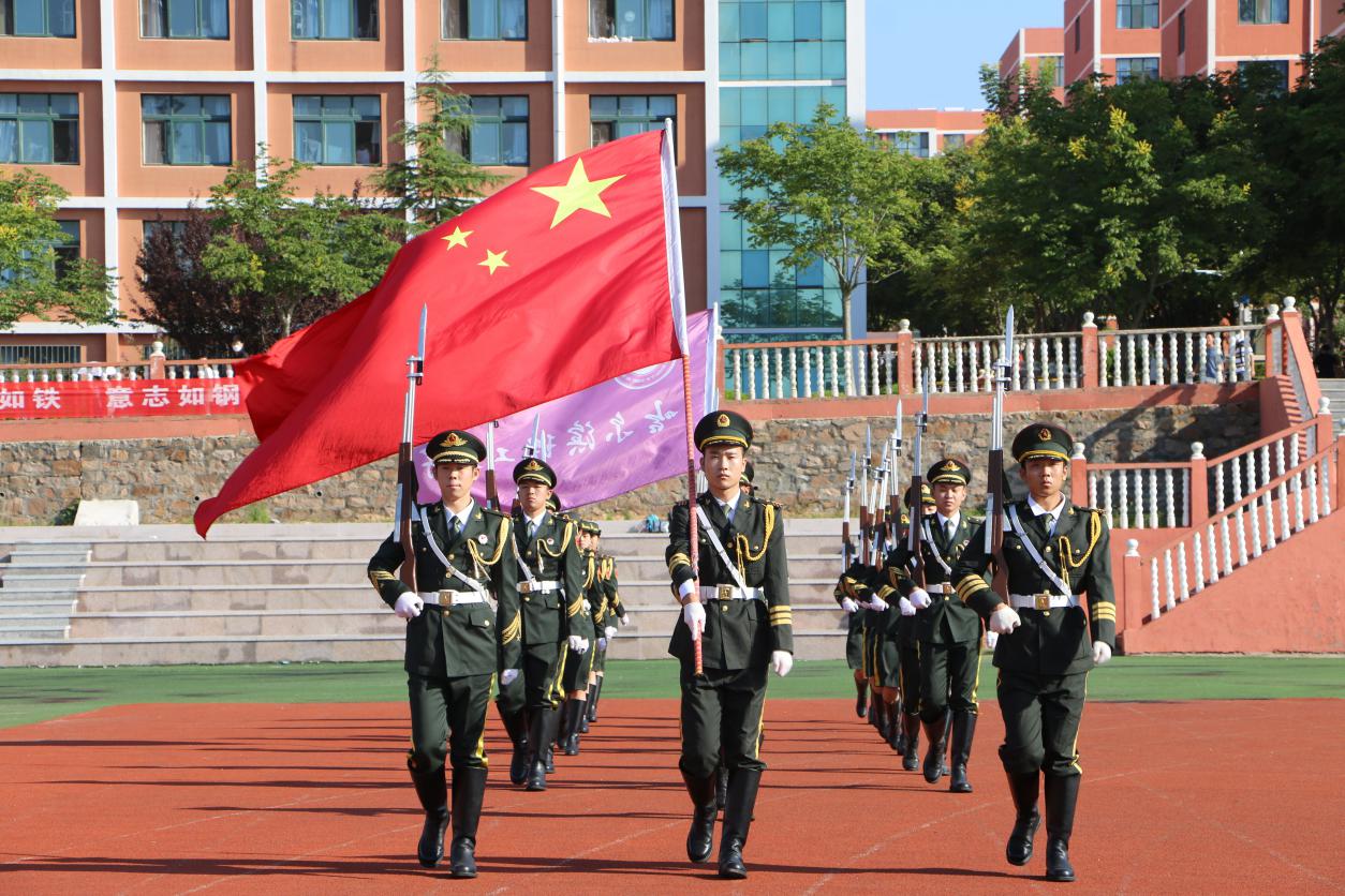 国旗护卫队22名学生,身着整齐的服装,踏着坚定的步伐英姿飒爽走向升旗台。全场肃立,升国旗奏国歌,升校旗奏校歌。