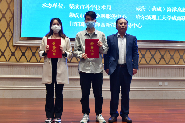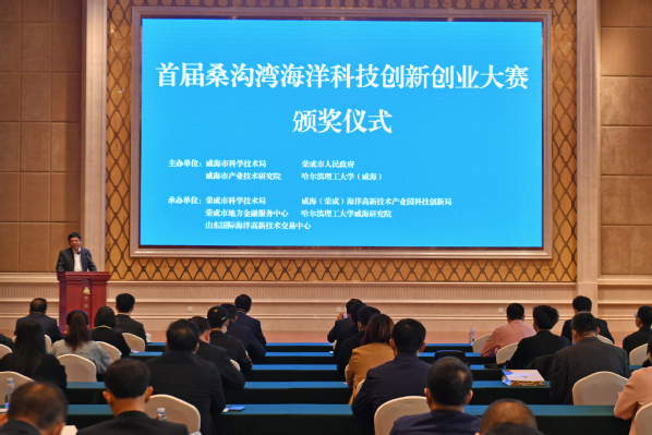 10月27日上午,首届桑沟湾海洋科技创新创业大赛颁奖仪式在华星宾馆天槎厅举行。威海市科技局局长王厚全、威海市产业技术研究院院长汤占胜、哈尔滨理工大学荣成学院党委书记张立双、荣成市副市长刘峰、威海市科技局副局长王军伟、荣成市科技局局长迟勇猛以及威海各区市科技部门负责人,荣成市政府部门负责人及企业负责人参加仪式。会议由荣成学院常务副院长杜野主持。