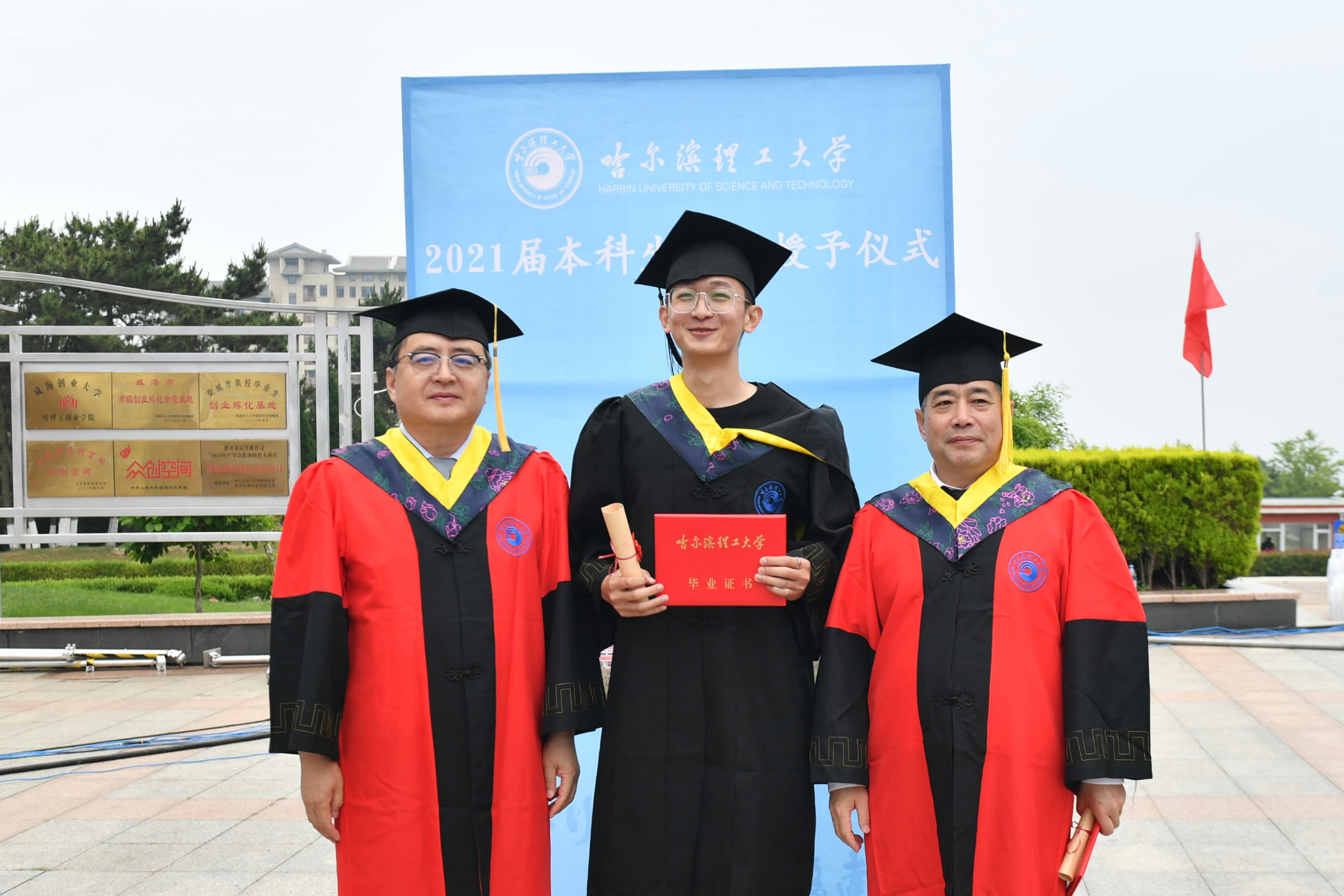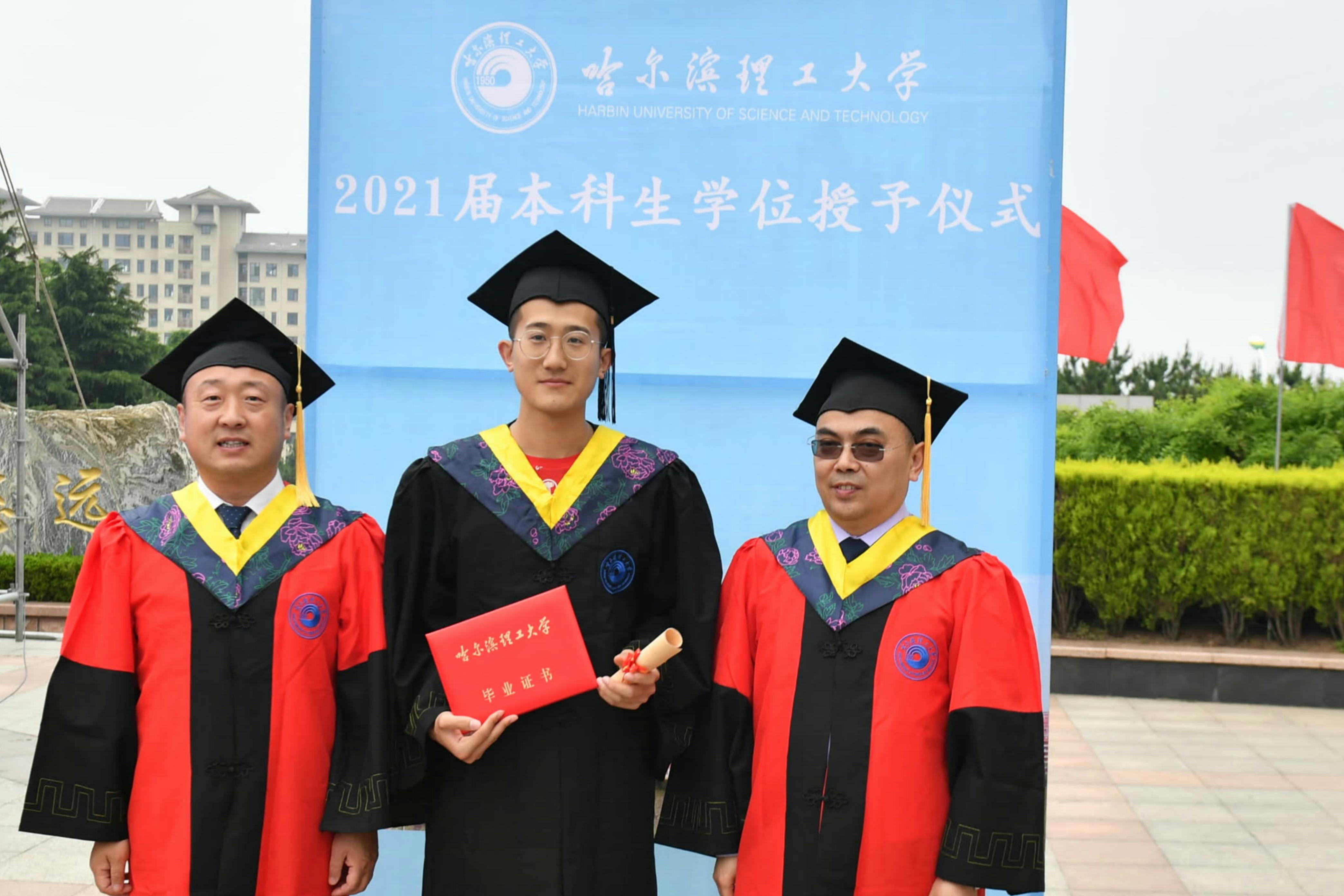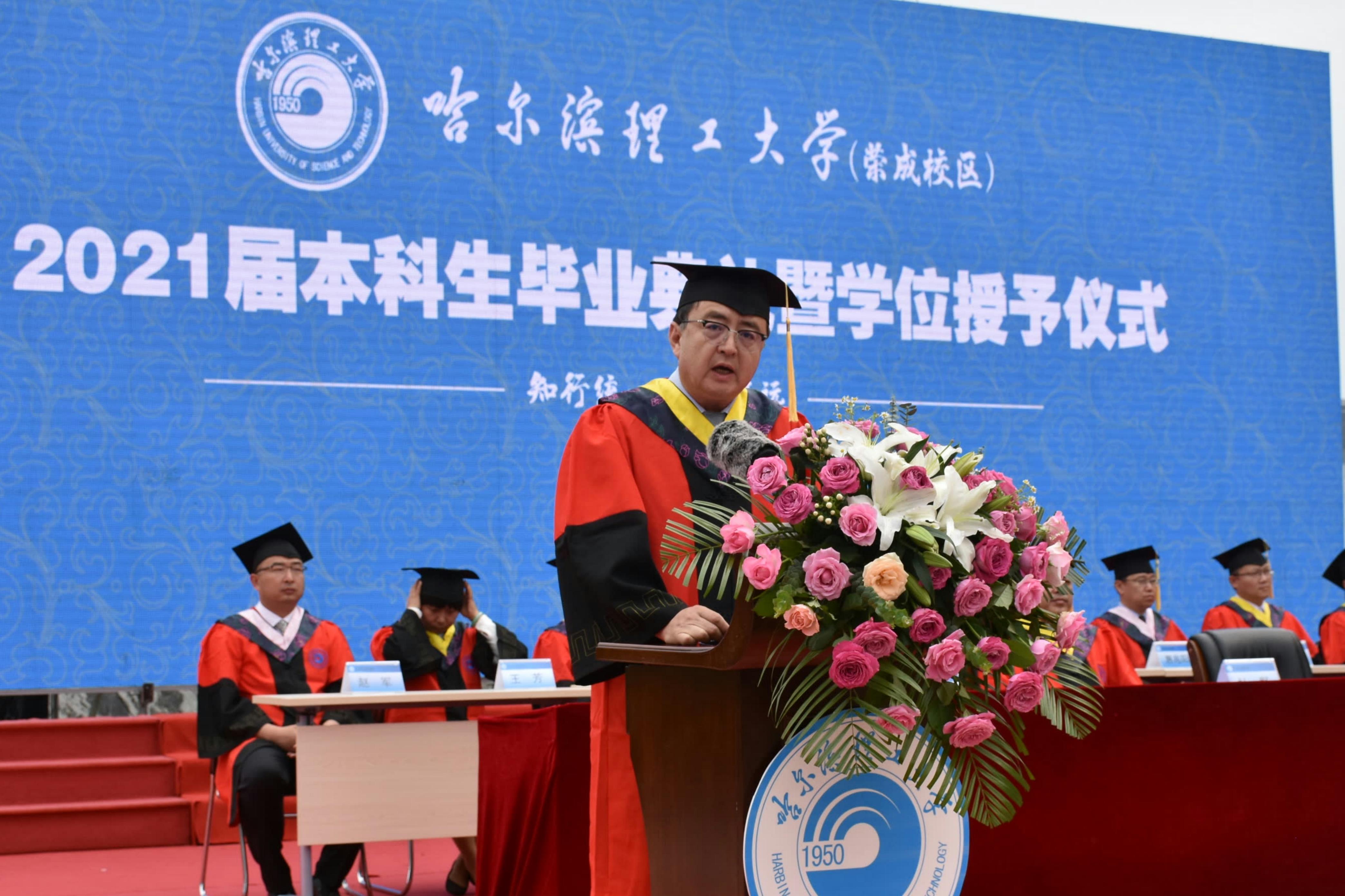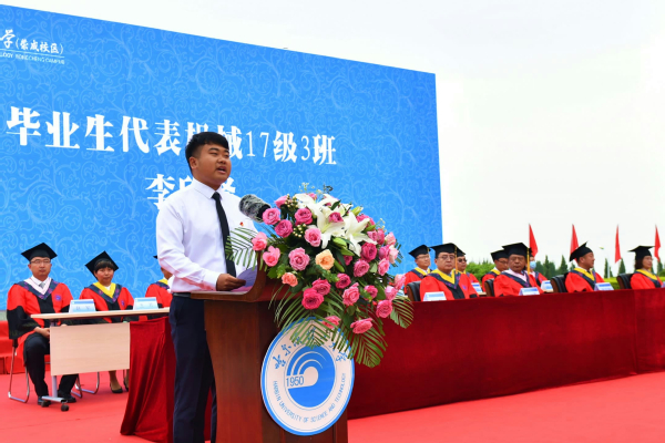 2021届毕业生代表、机械设计制造及其自动化专业的2021届毕业生李欣泽发言,他深情回顾了自己来校求学的四年时光,他说,在哈理工,自己收获了知识和技能、感受到了亲情和温暖、懂得了责任和担当,表达了对母校的不舍和感激之情。