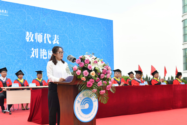 教师代表、基础部刘艳丽老师发言,刘艳丽老师首先祝贺大家学有所成,希望大家不管何时都不要放弃学习,要相信知识可以带来最忠诚、最可靠的底气;希望全体毕业生在未来人生的奋斗之路上,不负时代重任,不负学校嘱托;希望同学们在今后的生活和工作中不忘初心、牢记使命、不负韶华、勇往直前。