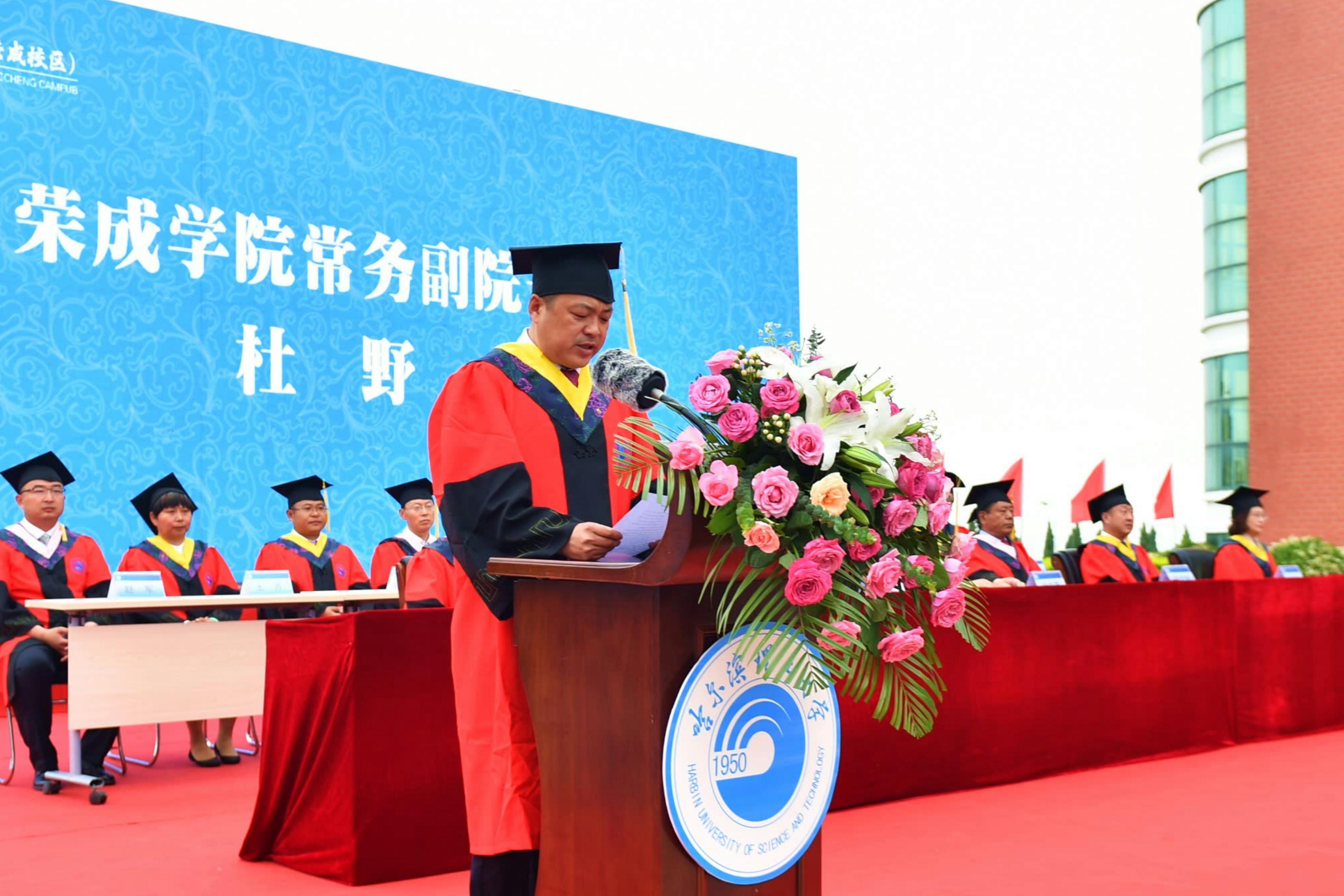 荣成学院常务副院长杜野宣读关于表彰十佳毕业生、优秀毕业生、志愿服务基层优秀毕业生的决定