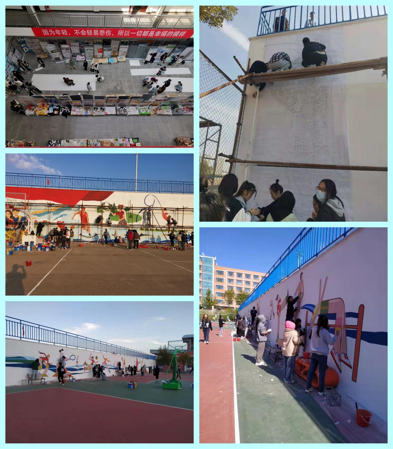 本次墙体彩绘以“爱我中华,美化校园”为主题,旨在弘扬爱国精神,鼓励师生积极参加体育运动,提高综合素质。在学院教务、后勤、资产等部门的大力支持下,由艺术系杨东宇主任统一组织协调,在刘海英、张廷林、任新光、历套、阮考等教师的积极指导下,近180多名学生充分利用因疫情期间无法外出写生、实训的实践课程时间参加墙体彩绘活动。经过初稿绘制、拓印及墙面涂刷上色等工艺过程,师生用手中的画笔表现出对祖国的热爱和对艺术的执着,同学们踩着脚手架、身系安全绳,克服深秋时节寒冷多风的户外环境,在体育馆两侧高达7米、总面积近1000平米的墙面上描绘了在祖国教育事业蓬勃发展的时代背景中,新时期学生积极参加体育锻炼、强健体魄,展现爱国强国精神、焕发青春活力的艺术长卷。