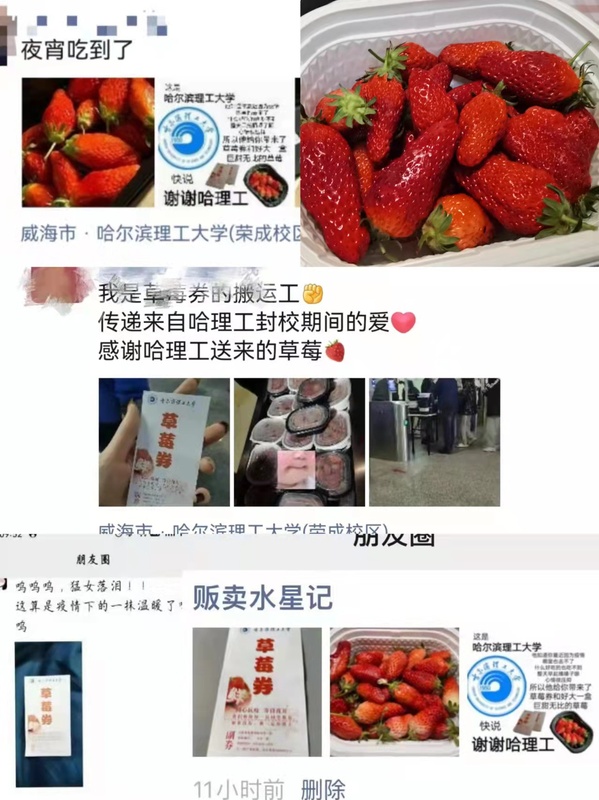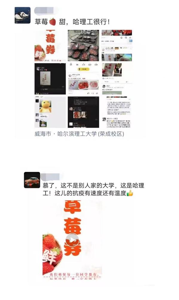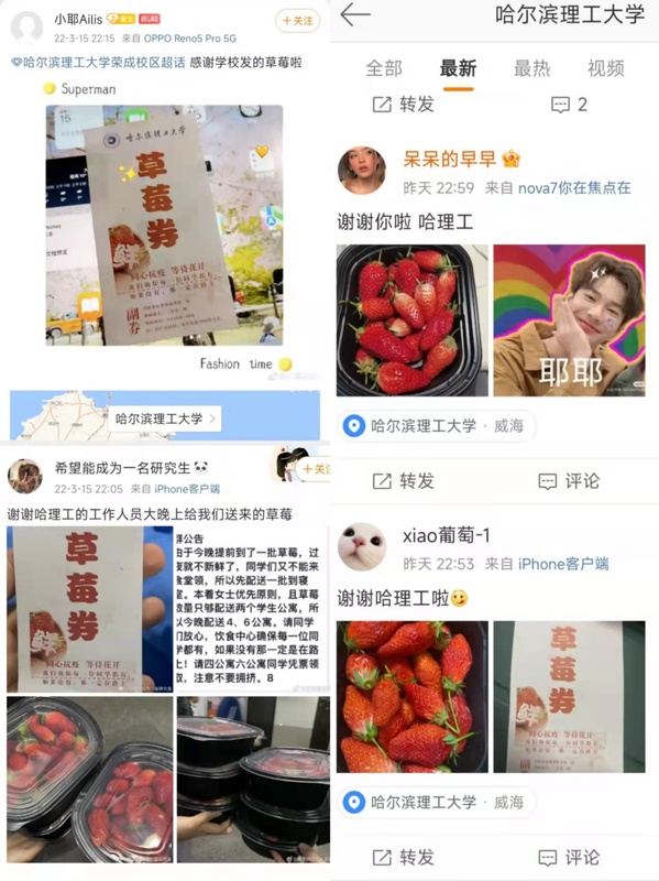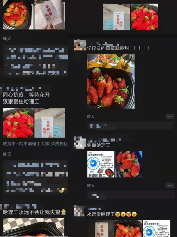 我们看到,理工校园一方面严防死守,出台了一系列管理措施,安排教职工驻守把关,合理有效地引导学生有序就餐以及购物、洗浴;另一方面,“严”中仍然不乏温情——春风送来了学院发放的“草莓劵”。