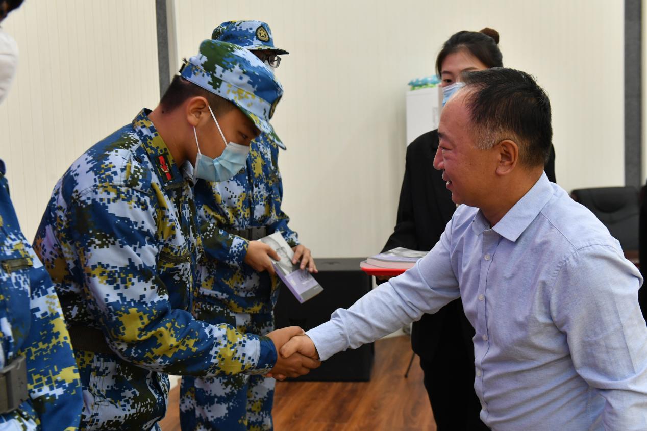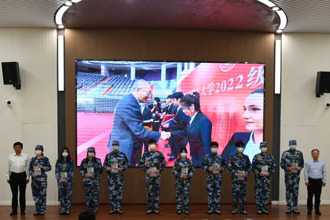 荣成学院党委书记张立双,院长段宏伟在分会场为荣成学院2022级本科新生代表颁发《王大珩传》。