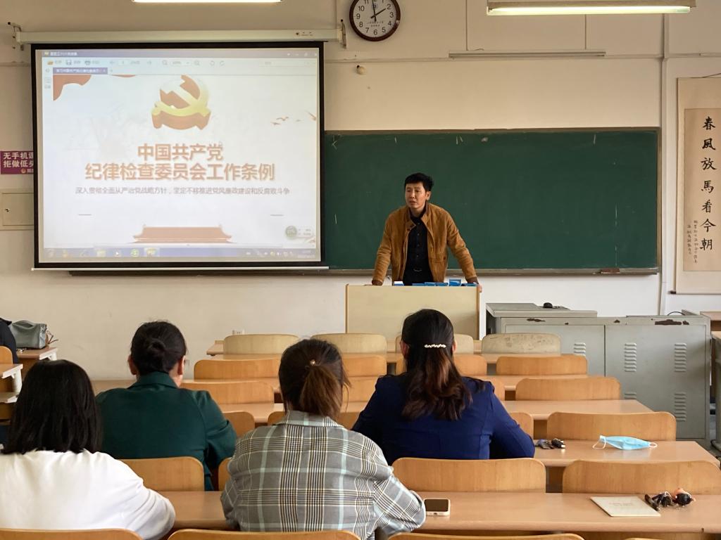 10月25日下午2:00,荣成学院党委副书记赵运平在4号教学楼C305为外语系教工党支部全体党员开展专题讲座。以“拒腐败,承正气”为主题,深入学习《中国共产党纪律检查委员会工作条例》(以下简称《条例》),外语系教工党支部成员积极交流发言。
