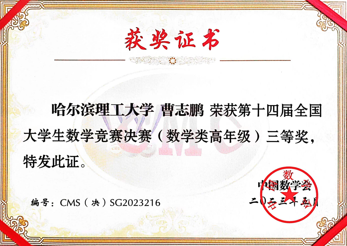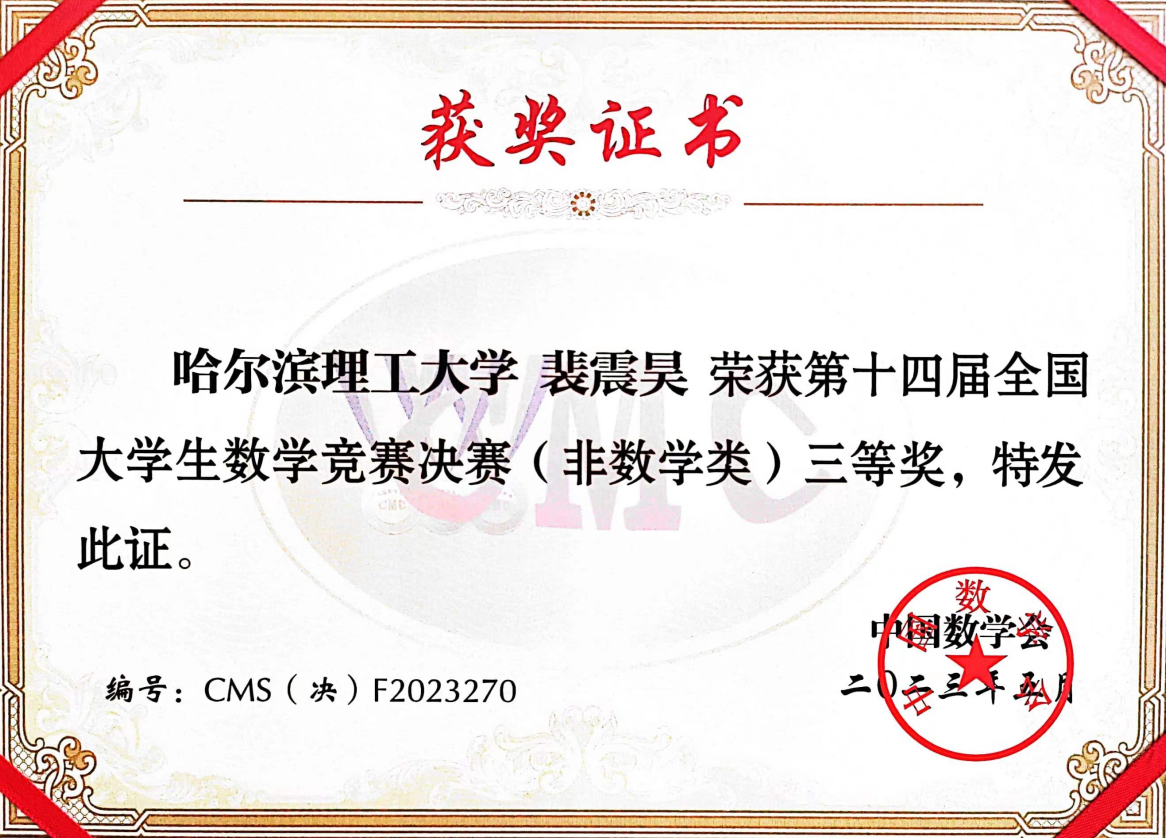 本次竞赛的初赛共有32个赛区逾23万名学生报名参加,经过选拔共有来自清华大学、北京大学等高校的922人参加决赛,决赛规模也为历届之最。我校2名同学进入数学组和非数学组的全国决赛,2019级信息与计算科学专业曹志鹏、2019级电子科学与技术专业裴震昊代表黑龙江赛区参赛,均荣获了全国决赛三等奖的好成绩。