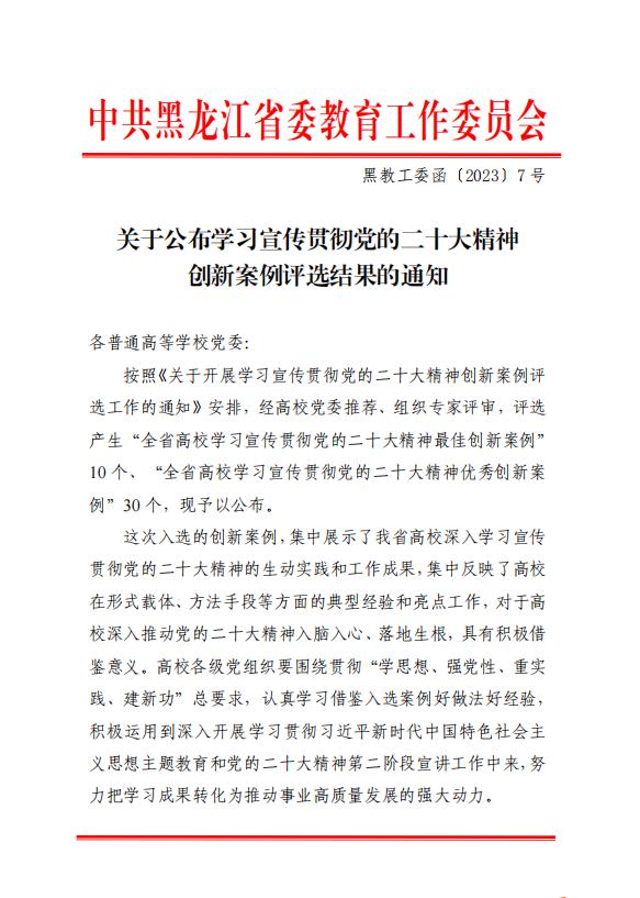 本次学习宣传贯彻党的二十大精神创新案例评选,是由省委教育工委组织开展,经高校党委推荐、组织专家评审,评选产生了“全省高校学习宣传贯彻党的二十大精神最佳创新案例”10个、“全省高校学习宣传贯彻党的二十大精神优秀创新案例”30个。自党的二十大胜利召开以来,学校党委高度重视党的二十大精神学习宣传贯彻,着力推动“第一时间”跟进学、“示范带动”规范学、“融入课堂”深入学;着力开展高位推动覆盖讲、上下贯通融合讲、先优典型特色讲;着力与提能力、转作风相结合、与推行“马上就办”相结合、与“引育留用”一体推进的人才工作格局相结合,助力龙江全面振兴全方位振兴,展示了我校在深入推动党的二十大精神入脑入心、落地生根的生动实践、亮点工作和典型经验,为深入学习贯彻党的二十大精神提供了积极借鉴。