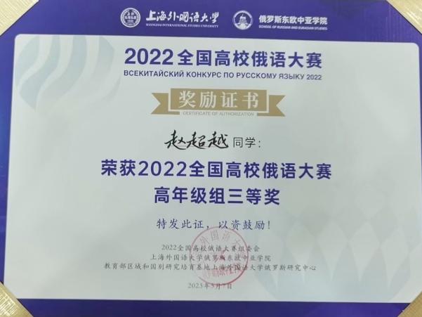 为深入学习贯彻习近平新时代中国特色社会主义思想,持续推进我国与欧亚地区国家及上海合作组织框架下的教育交流合作,着力培养“讲好中国故事”的俄语人才,由教育部国际合作与交流司主办、上海外国语大学承办的2022全国高校俄语大赛决赛在上海举行。外国语学院俄语19-2班赵超越同学获三等奖。