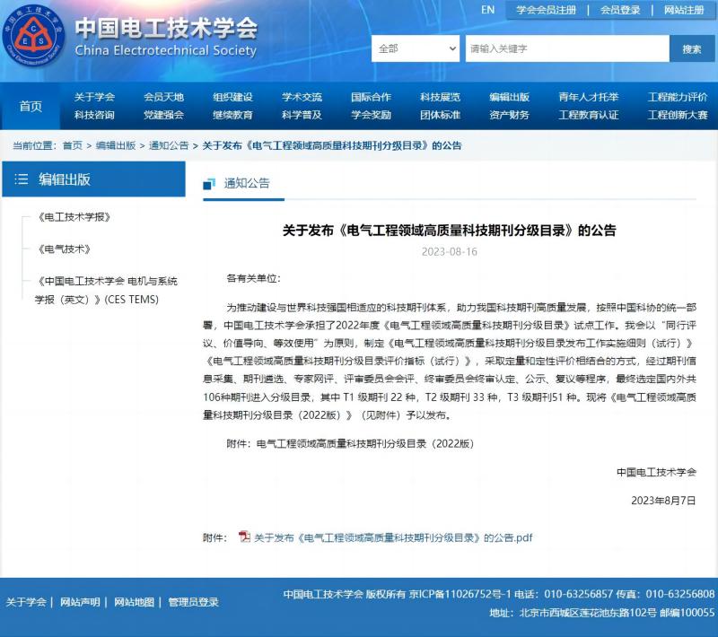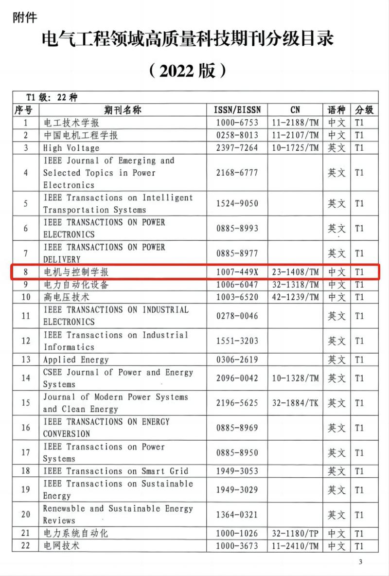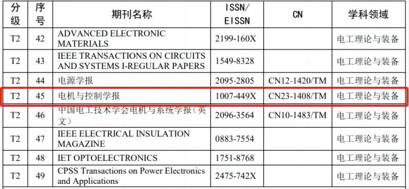 为落实中国科协、中宣部、教育部和科技部联合印发的《关于深化改革培育世界一流科技期刊的意见》精神,推进国内外科技期刊的同质等效使用,助力我国科技期刊高质量发展,近日,中国电工技术学会和中国电机工程学会分别发布了《电气工程领域高质量科技期刊分级目录(2022版)》和《能源电力领域高质量科技期刊分级目录(2022年版)》,我校期刊《电机与控制学报》分别首次入选T1级(最高级)和T2级,T1级是已经接近或具备国际一流期刊,T2类是国际知名期刊。