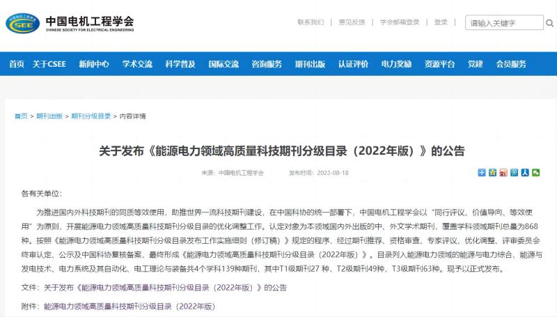 中国电机工程学会从868种覆盖学科领域的期刊中遴选出139种期刊列入《能源电力领域高质量科技期刊分级目录(2022年版)》,包括T1 级期刊27种,T2级期刊49种,T3级期刊63种,《电机与控制学报》位列T2级。