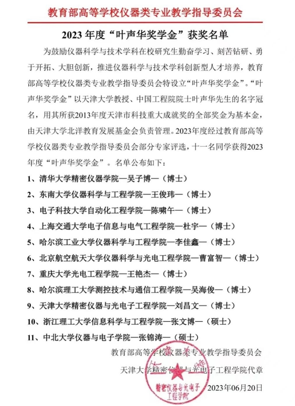 【主题教育】喜报:科教融合协同育人再创佳绩——我校仪器科学与技术博士生首获“叶声华奖学金”
