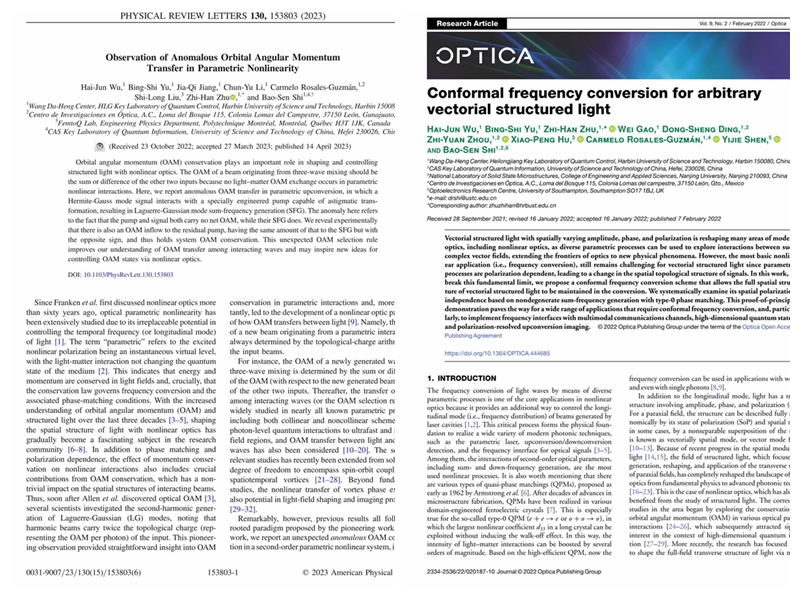 吴海俊同学是测控技术与通信工程学院仪器科学与技术学科硕博连读博士研究生,在导师的悉心培养下,围绕“高维量子接口的物理实现”开展光学基础理论与实验研究,每天都沉浸在实验室中刻苦钻研,经过几年不懈的努力,吴海俊同学取得了显著的成长和丰硕科研成果,在学期间三次获得国家奖学金,先后在Phys. Rev. Appl.以及Opt. Lett.等光学权威期刊发表数篇高质量文章,近期又接连在物理、光学顶刊Phys. Rev. Lett.和Optica上发表高影响力原始创新成果。这些业界公认的高水平成果证明该生在国内同届优秀研究生中位列拔尖,并得到教育部专委会的认可,与国内一流学科平台培养的其它8位拔尖博士生一同获得了本年度“叶声华奖学金”。