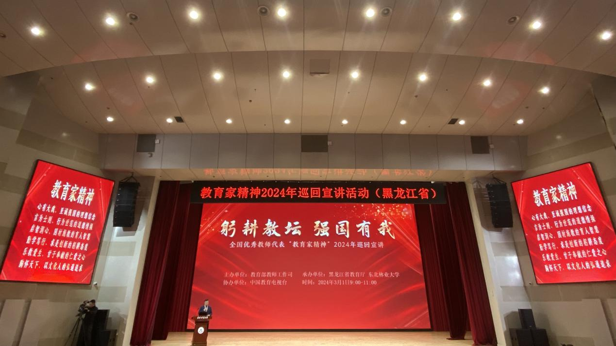为贯彻落实习近平总书记关于弘扬教育家精神的重要指示精神,营造全社会学习和弘扬教育家精神的良好氛围,激励广大人民教师践行教育家精神,由中宣部、教育部组织开展的教育家精神2024年巡回宣讲活动(黑龙江省)于3月1日上午在东北林业大学科学会堂举行。我校选派34名教师代表在线下主会场参加宣讲活动,其他教师线上观看了宣讲。