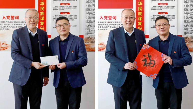 赵琳书记向张凤鸣教授送上慰问金和“福”字