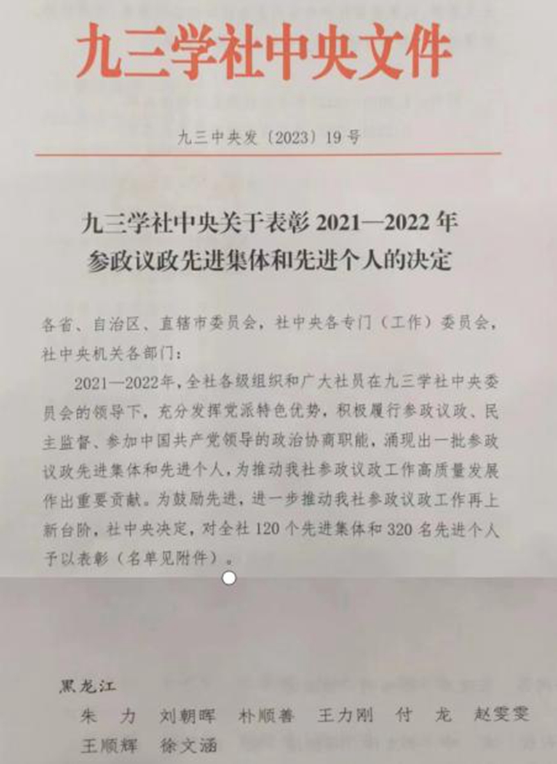王顺辉(九三学社哈尔滨理工大学副主委)被社中央评为参政议政先进个人