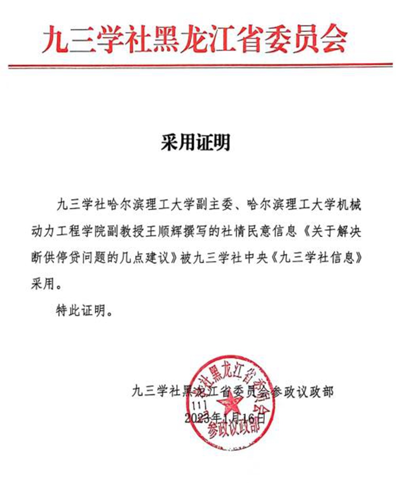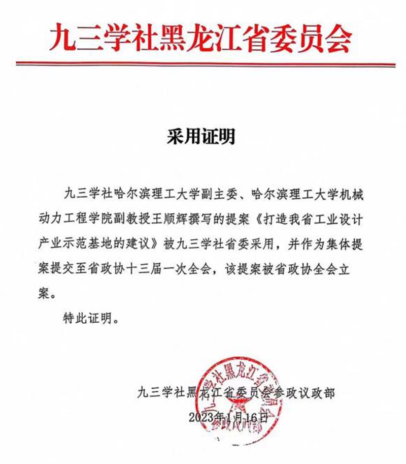 九三学社哈尔滨理工大学副主委王顺辉撰写的提案被九三学社省委采用并被省政协立案