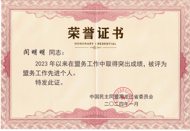 闫明明(民盟哈尔滨理工大学委员会主委)荣获盟务工作先进个人