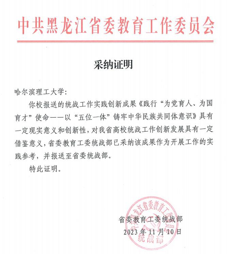 近期,我校党委统战部陆续收到省委教育工委、各民主党派省委的表彰通知和采用证明。一年以来,我校统一战线成员、民主党派基层组织、政协委员凝心聚力、携手前进,荣获多项荣誉,九三学社哈尔滨理工大学支社主委王义文当选九三学社中央教育文化专门委员会委员,九三学社哈尔滨理工大学支社副主委王顺辉获九三学社中央2021-2022年度参政议政先进个人,民盟哈尔滨理工大学委员会主委闫明明荣获省盟务工作先进个人,闫明明完成的调研报告荣获优秀调研成果三等奖,闫明明被聘为第八届省人民检察院特约检察员。广大政协委员为龙江发展建言献策,助力龙江全面振兴、全方位振兴,2023年建言献策被采纳21项,国家级采纳2项、省级采纳13项、市级采纳4项。我校1项统战实践创新成果被省委教育工委采纳并报送省委统战部。