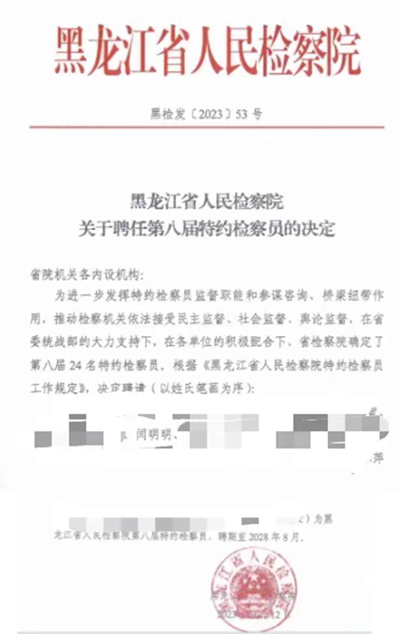 黑龙江省人民检察院聘任闫明明(民盟哈尔滨理工大学委员会主委)为第八届特约检察员