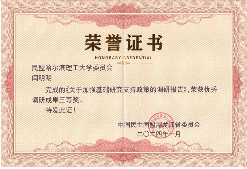 闫明明(民盟哈尔滨理工大学委员会主委)完成的调研报告荣获优秀调研成果三等奖