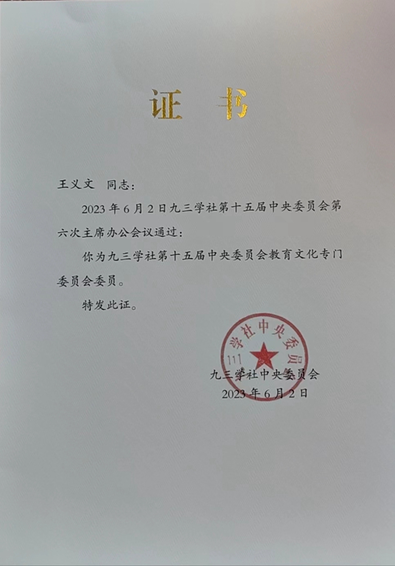 王义文当选九三学社中央教育文化专门委员会委员