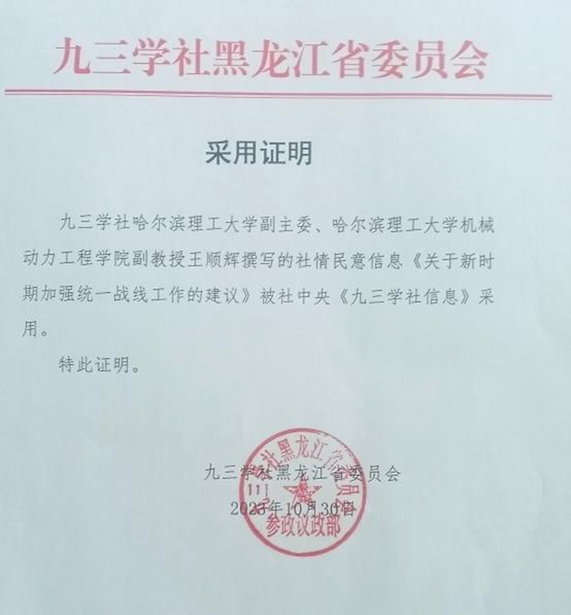 九三学社哈尔滨理工大学副主委王顺辉撰写的2份社情民意信息被九三学社中央《九三学社信息》采纳