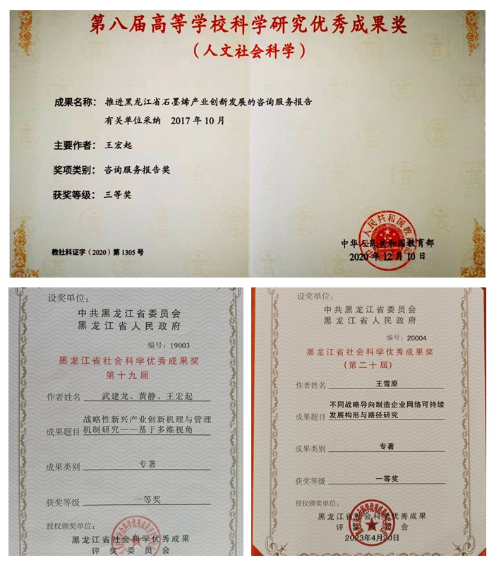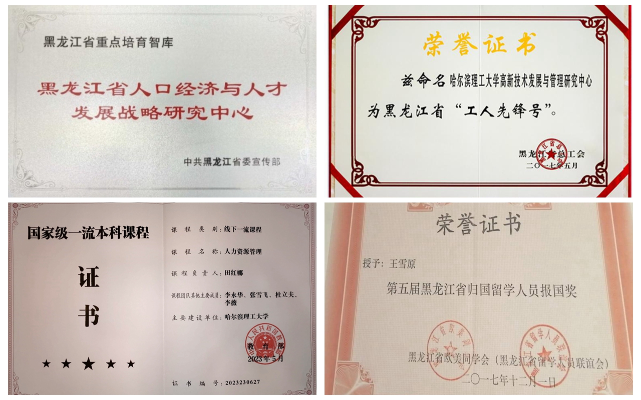 近五年来,人资系教师在中国软科学、科研管理、Technological Forecasting & Social Change等重要学术期刊发表论文74篇,主持国家自然科学基金、国家社会科学基金、教育部人文社科基金项目7项,获得教育部人文社科类优秀成果三等奖1项、黑龙江省社会科学优秀成果一等奖3项。获评“人力资源管理”国家级一流本科课程1门和“大学生职业生涯规划”、“劳动经济学”两门黑龙江省一流本科课程,支部教师获批教育部产学研协同育人项目1项,省高等教育教学改革研究项目5项,黑龙江省高等教育教学改革二等奖等奖项3项,出版专著6部。