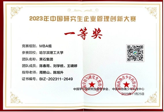 历经校内选拔赛和全国赛初赛、复赛,由哈尔滨理工大学工商管理(MBA)专业陈春雨、刘学统、王啸婷同学组成的参赛队伍“黑石集团”队,工程管理和工商管理学专业于明智、齐堃宇、王小平、冯思庆同学组成的参赛队伍“创新Genius”队进入全国总决赛,并分别在MBA组和其他研究生组获得全国一等奖。哈尔滨理工大学作为MBA组和其他研究生组进入决赛的13所院校之一,首次参赛在双赛道均荣获得全国一等奖。