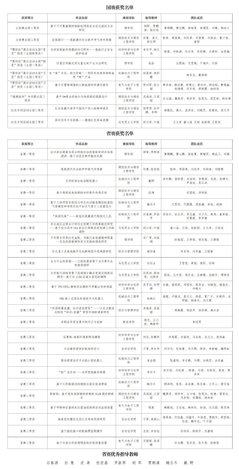 学校在本届全国“挑战杯”竞赛全部赛道均有获奖。主体赛获全国三等奖2项。“揭榜挂帅”专项赛获全国三等奖1项。“黑科技”展示活动获全国“星系”级奖(全国特等奖)1项,获“恒星”级奖(全国一等奖)1项,获“卫星”级奖(全国三等奖)2项。红色专项活动获全国三等奖2项。在此前省级竞赛中,我校获一等奖6项,二等奖7项,三等奖12项,各项成绩居全省高校前列,学校捧得“优胜杯”,胡军等9位教师获优秀指导教师称号。