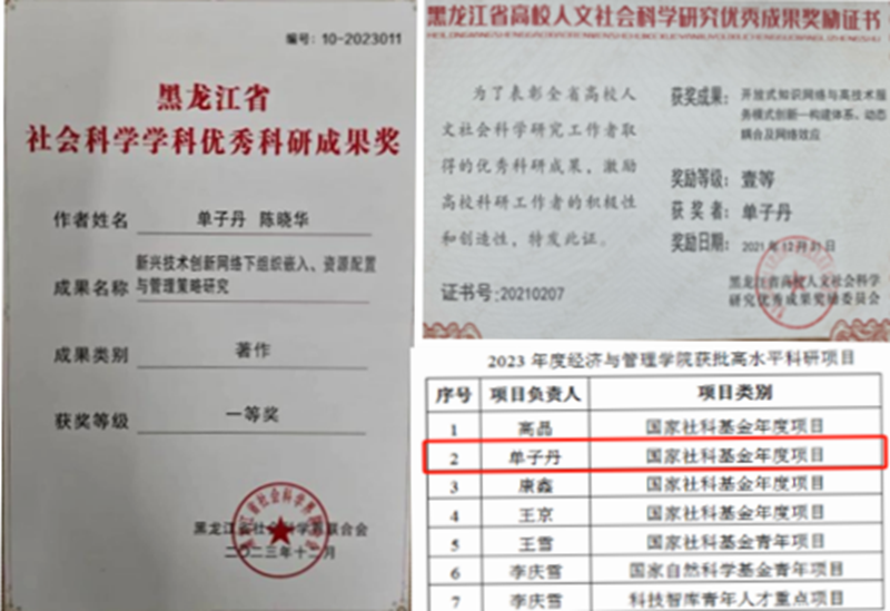 单子丹,中共党员,1980年7月出生。1999年起,她用了10年的时间完成了学业,先后取得了管理学学士、管理学硕士、管理学博士学位。2009年,赴哈尔滨工程大学从事博士后研究工作,2010年,赴清华大学经济与管理学院作访问学者,2015年,赴美国布兰迪斯大学Heller商学院作访问学者。现任经济与管理学院教授,博士研究生导师,校管理科学与工程(数字化制造系统与智能决策)学科方向带头人,校重点实验室(信息管理与信息系统)负责人。担任国家自然科学基金项目函评专家,教育部人文社科项目函评专家,全国专业学位水平评估专家,教育部学位中心学位论文通讯评议专家,多省市科技攻关项目、省自然基金项目函评专家,省重点培育智库专家、省知识产权保护中心专家、省工业和信息化厅专家、省人民政府质量奖首席评审专家。多年从事复杂网络建模与系统评价,平台型组织战略,数智化供应链制造与服务管理等研究热点,取得了显著的科研成果。先后主持国家自然科学基金项目(后评估为优)、国家社会科学基金项目、中国博士后科学基金特别资助项目、教育部人文社科项目、山东省重点研发计划(软科学)重点项目、省哲学社科项目、哈尔滨市创新人才项目等。在SCI、SSCI、CSSCI、EI源刊等发表论文70余篇,数篇被转载和他引。出版学术专著5部,获得研究奖励8项。多次作为专家参与硕博研究生培养方案、硕博学位点审核评估、本科审核评估、人才梯队建设等工作。