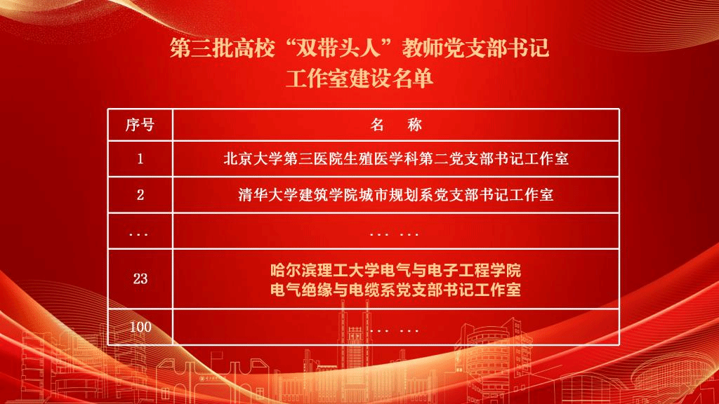 近日,教育部办公厅公示了第三批全国高校“双带头人”教师党支部书记工作室建设名单。我校电气与电子工程学院电气绝缘与电缆系党支部书记工作室成功入选,这是学校党建工作获得的又一项“国字号”标志性成果,也是黑龙江省属高校首次获此殊荣。
