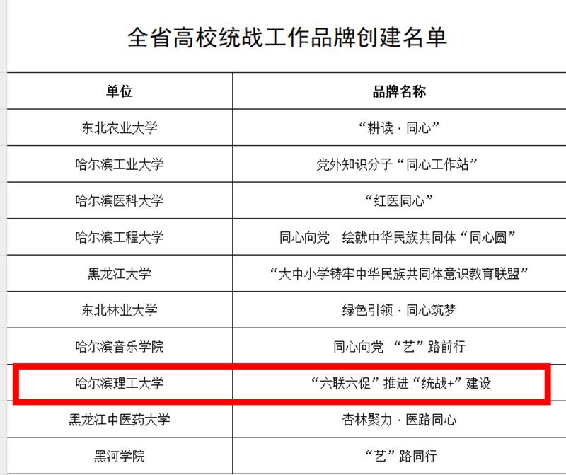 为深入贯彻落实中央和省委关于统一战线工作的部署,推动全省高校统一战线工作全面提质增效,打造一批具有龙江高校特色的统一战线工作品牌,省委统战部、省委教育工委组织开展了高校统战品牌评选创建工作,经过展示和现场答辩,我校获首批黑龙江省高校统战工作品牌创建单位。