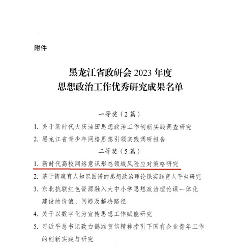日前,黑龙江省思想政治工作研究会通报了《黑龙江省政研会2023年度思想政治工作优秀研究成果名单》,全省共产生一等奖2篇,二等奖5篇,三等奖10篇,优秀奖10篇。学校党委宣传部成果《新时代高校网络意识形态领域风险应对策略研究》获得二等奖。