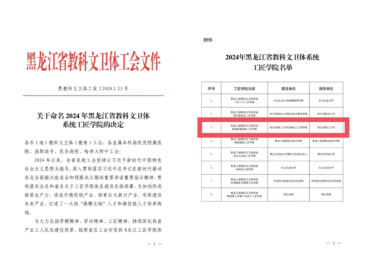 为大力弘扬劳模精神、劳动精神、工匠精神,持续深化我省产业工人队伍建设改革,加快形成新质生产力,改造升级传统产业、培养壮大新兴产业、布局建设未来产业,按照省总工会印发的《龙江工匠学院体系建设三年行动方案(2024-2026年)》有关要求,省教科文卫体工会命名8家市级(产业)工匠学院,我校机械动力工程学院凭借卓越的实力和特有的优势在激烈的竞争中脱颖而出,被命名为“黑龙江省教科文卫体系统高端装备制造工匠学院”,为学校争得了荣誉。