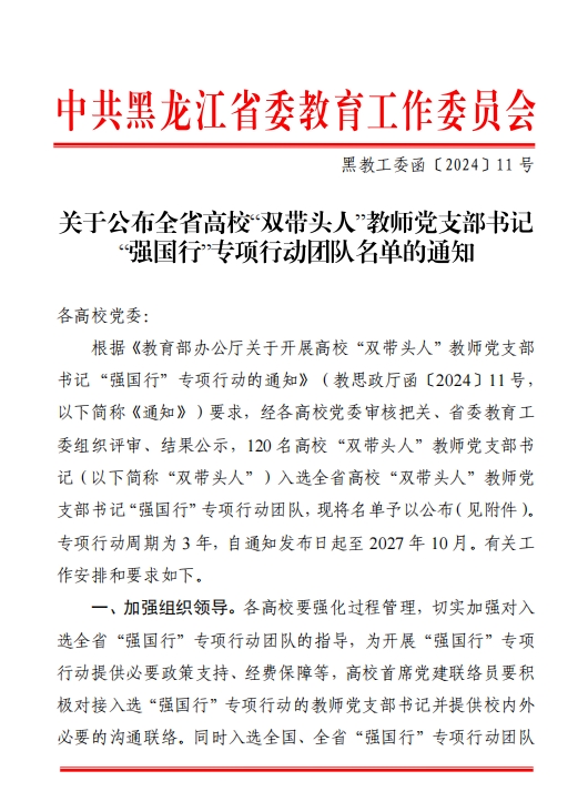 近日,省委教育工委发布《关于公布全省高校“双带头人”教师党支部书记“强国行”专项行动团队名单的通知》,我校继2个党支部入选国家级团队后,在省级“强国行”专项行动中再次斩获佳绩,6个党支部成功入选省级“强国行”专项行动团队,入选团队数量位于全省高校前列。