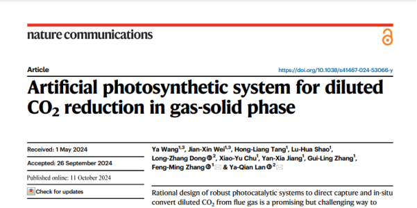 近日,我校材料科学与化学工程学院张凤鸣教授团队关于烟道气二氧化碳高效转化的研究成果取得重要进展,研究成果以“Artificial photosynthetic system for diluted CO2reduction in gas-solid phase”为题,发表于国际顶级期刊Nature Communications,这是团队时隔一年再次刊发,我校为第一完成单位,青年教师王雅为论文第一作者。