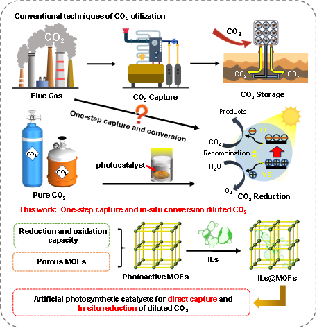 将烟道气中二氧化碳(CO2)直接捕集并原位转化,是CO2资源化利用和实现碳中和目标的有效手段。然而,由于烟道气中CO2浓度相对较低,导致常规催化剂容易失活。针对该科学问题,张凤鸣教授团队提出将低浓度CO2富集组分与金属有机框架(MOFs)光催化剂耦合的策略,构筑了离子液体装载到PCN-250孔道中的[Emim]BF4@MOFs光催化剂,实现烟道气CO2的直接吸附并原位高效转化。