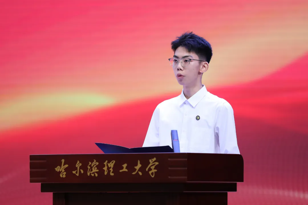 获奖学生代表、机械专业22级9班王睿汉在仪式上发言。他表示,此次获评“儒苑英才”奖学金,不仅是学校对自己求学生涯的宝贵肯定,更是对自己未来探索的光荣激励。值此建校74周年之际,愿校庆之喜,如同春华秋实,收获满园桃李芬芳,学术之花常开不败,声誉之树四季常青。