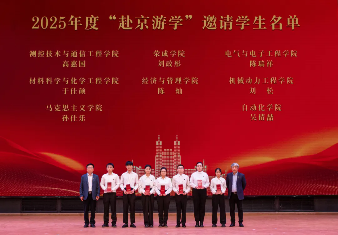 北京校友会原秘书长马绍魁(左一)和现任秘书长邵文杰(右一)向2025年赴京游学学生发放邀请函
