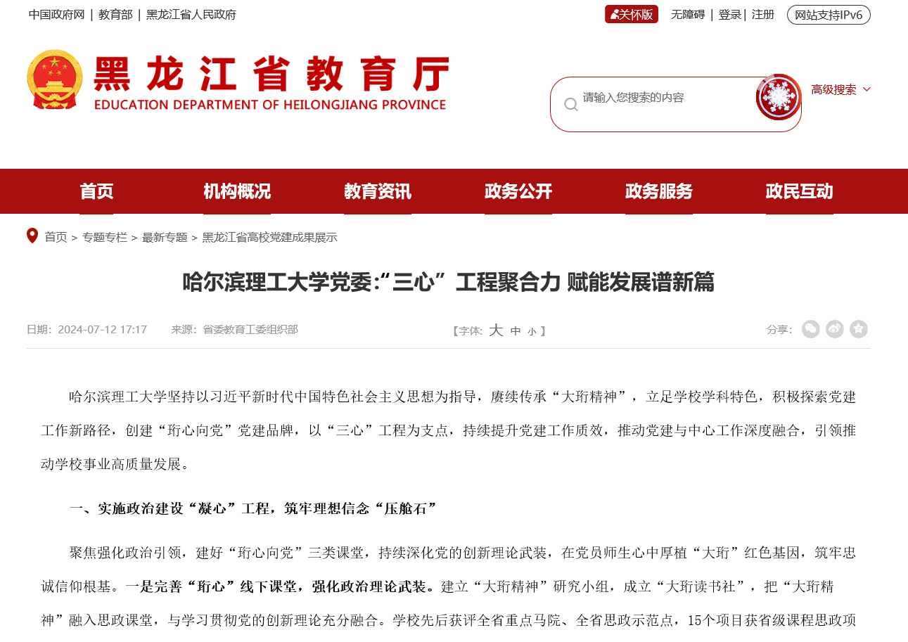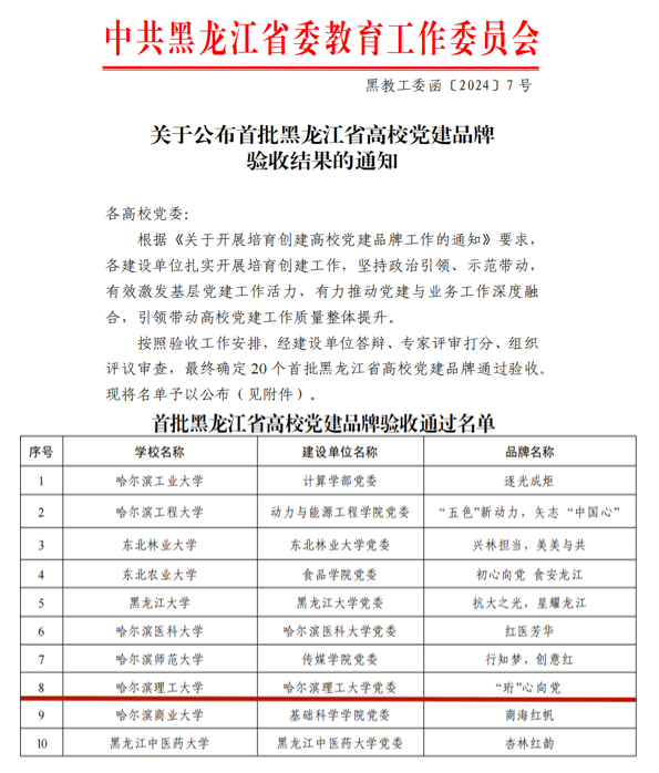 黑龙江省高校党建品牌建设是省委教育工委整体提升全省高校党建工作质量的重要举措,也是推动党建融入中心工作、引领推动高等教育事业发展的重要抓手。2023年3月省委教育工委公布了全省首批培育创建名单,我校“珩心向党”党建品牌成功入选,建设周期为一年。