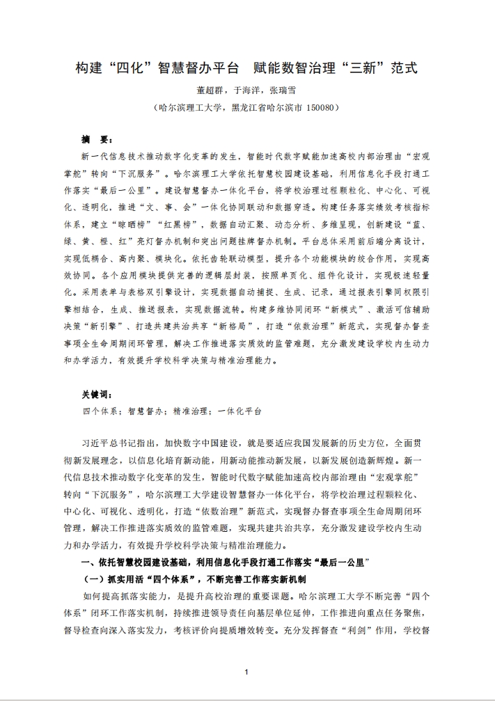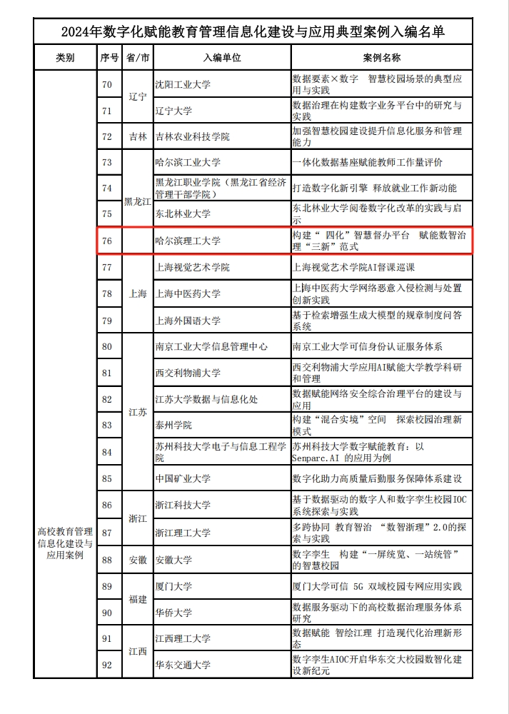 12月5日,教育部教育管理信息中心公布了2024年数字化赋能教育管理信息化建设与应用典型案例名单,由学校党委办公室 校长办公室与网络信息中心共同策划与撰写的《构建“四化”智慧督办平台 赋能数智治理“三新”范式》案例,经黑龙江省教育厅专家评审、推荐申报,教育部教育管理信息中心专家评定等程序,成功入选高校教育管理信息化建设与应用典型案例,并入编《中国教育信息化》杂志。全国范围内共评选出高校教育管理信息化建设与应用典型案例58项,黑龙江省有4所高校典型案例入选,也是我校首次入选。