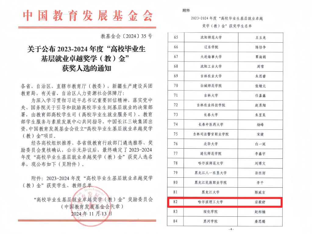 近日,全国高校毕业生基层就业卓越奖奖励委员会印发《关于公布2023—2024年度“高校毕业生基层就业卓越奖学(教)金”获奖人选的通知》,经过学校申报、省级推荐、奖励委员会评选,我校2017届毕业生宗毅舒荣获全国“高校毕业生基层就业卓越奖学金”,这是上级教育主管部门对我校毕业生基层就业工作给予的充分肯定,也是我校毕业生首次获得此项国家级殊荣。