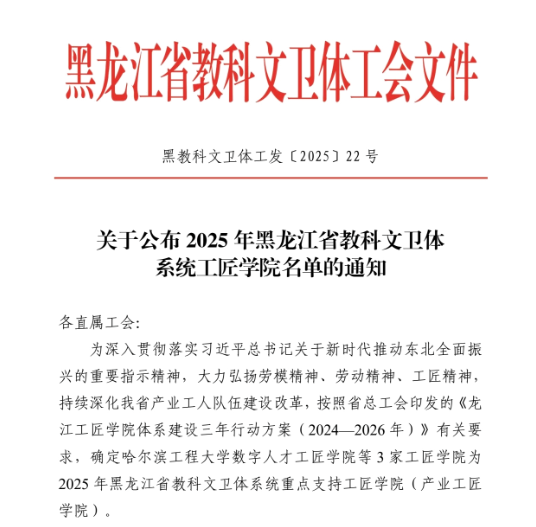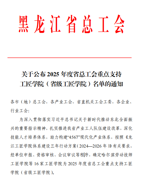 学校将以获批黑龙江省总工会和省教科文卫体系统重点支持的工匠学院建设为契机,积极打造工匠学院品牌,为助推龙江高质量发展提供技能人才支撑。校工会号召全校教职工以入选工匠学院为榜样,以饱满的热情、昂扬的斗志,在各自领域中励精图治、开拓创新,为把我校建设成为特色鲜明的国内一流理工科大学贡献智慧和力量。