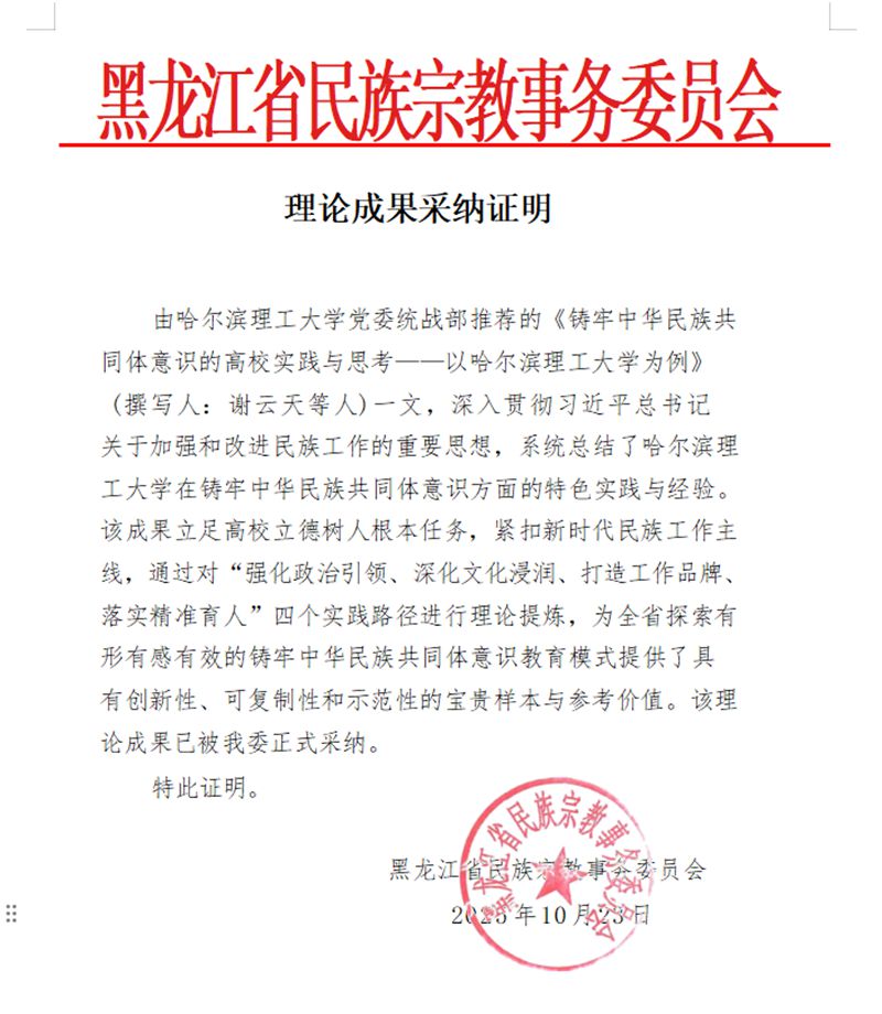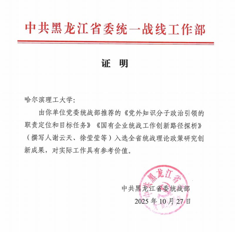 由学校经济与管理学院教师徐莹莹、马克思主义学院教师谢云天等人撰写的《国有企业统战工作创新路径研究》《党外知识分子政治引领的职责定位和目标任务》获省委统战部采纳,两篇成果聚焦国有企业统战工作提质、党外知识分子政治引领增效,为破解我省相关领域实践难题提供清晰路径;《铸牢中华民族共同体意识的高校实践与思考——以哈尔滨理工大学为例》获省民族宗教事务委员会采纳,文章从高校实践视角为全省铸牢中华民族共同体意识工作提供了可借鉴经验。